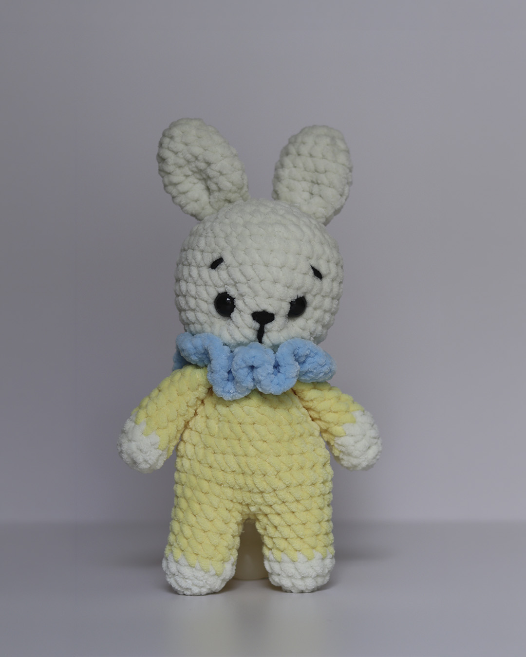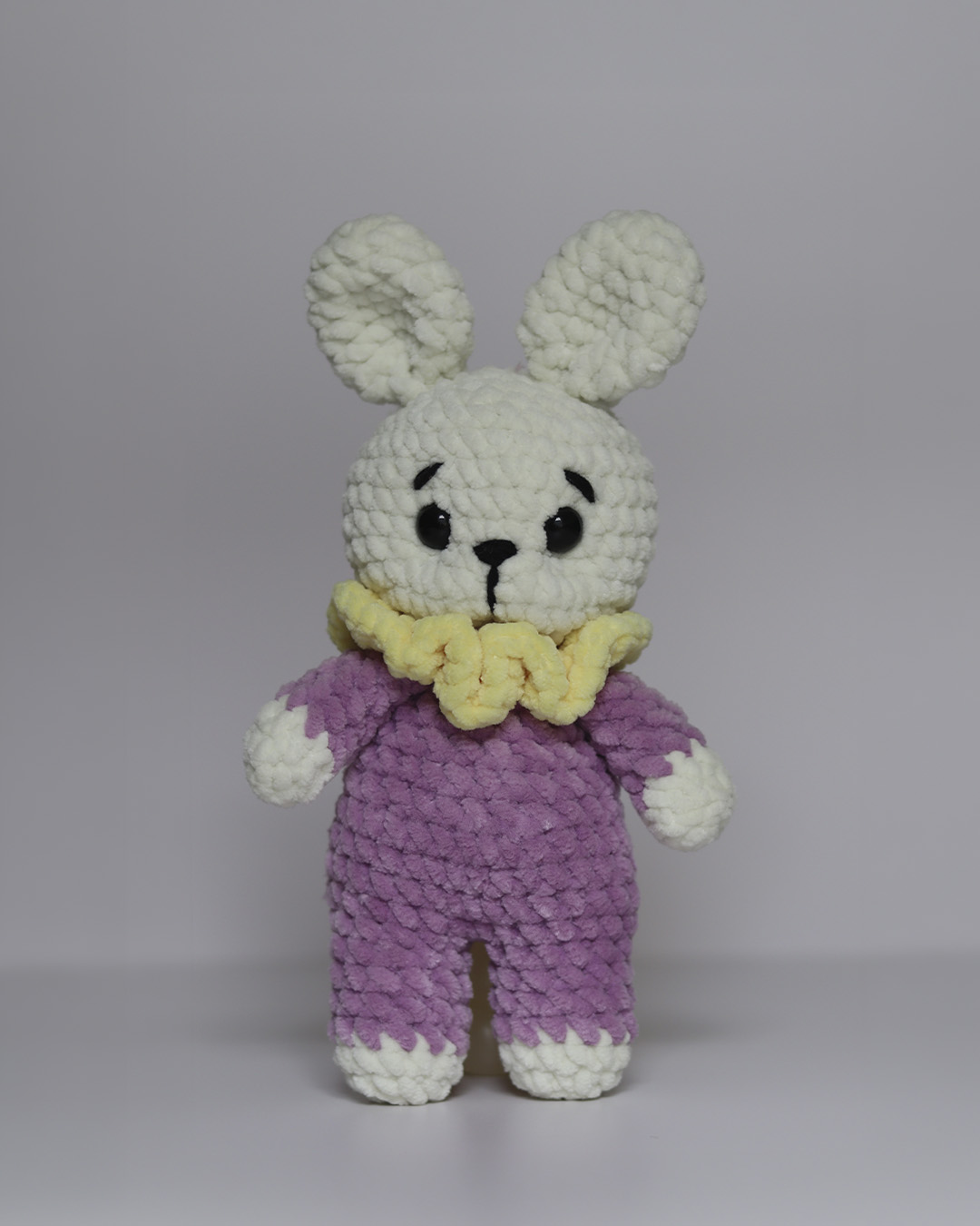 • Handmade crochet plush bunny • Premier Parfait Chunky Yarn (100% Polyester) – OEKO-TEX® certified • Hypoallergenic siliconized fiberfill • Cotton embroidery threads, felt, and sewing cotton • Safety eyes and nose • Spot clean only • Each piece is unique due to its handmade nature